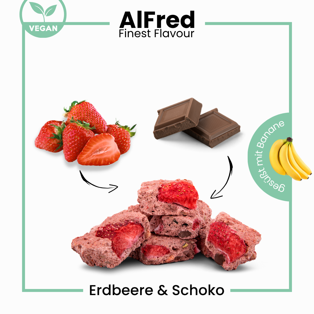Mit viel Liebe wird die Basisrezeptur von DailyFred für die Geschmacksrichtung Erdbeere Schoko mit fruchtigen Erdbeerstückchen dekoriert. Für das besondere Schokoladenerlebnis werden einzelne Schokostückchen verrührt und zusätzlich Schokoraspeln auf der Oberseite dekoriert. Dabei verwenden wir hochwertige Schokolade aus reinem Kakao und Kakaobutter.